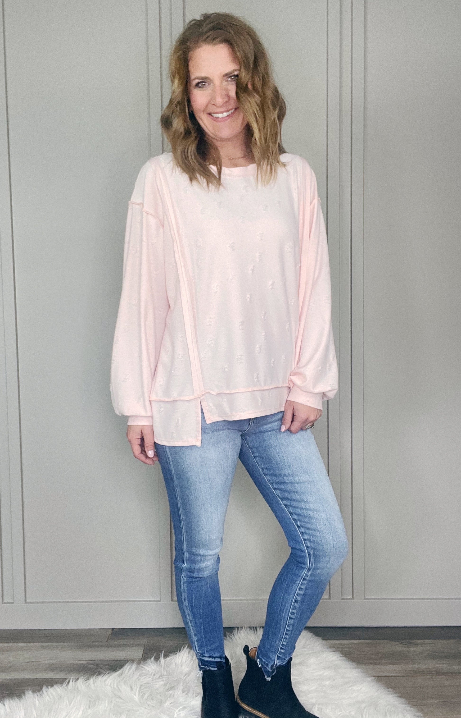 DISTRESSED KNIT OPEN SEAM STITCHED SLIT HEM TOP