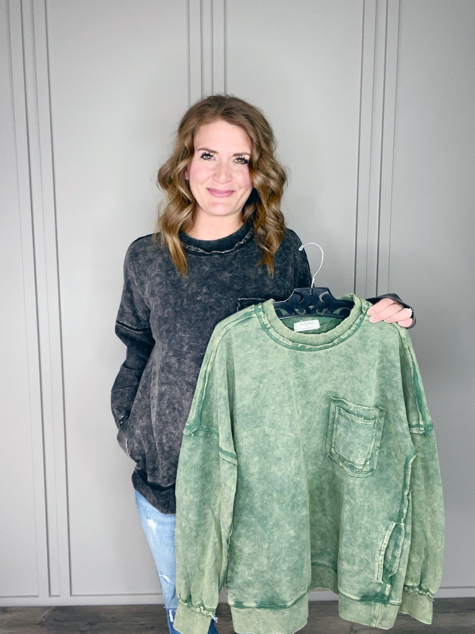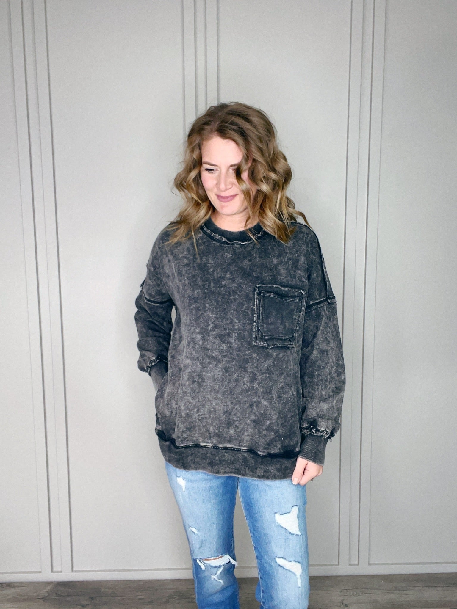 FRENCH TERRY ACID WASH RAW EDGE POCKET PULLOVER