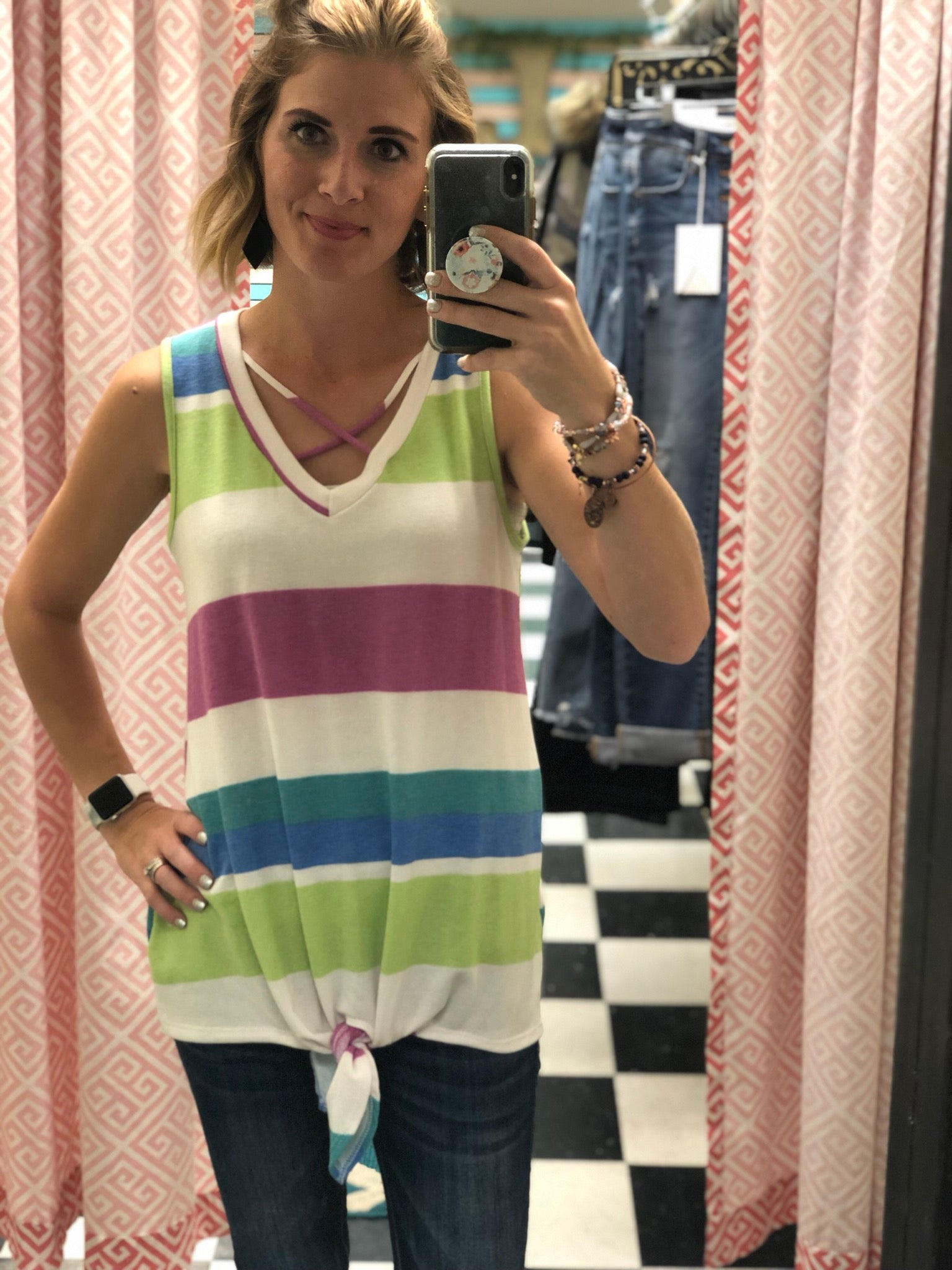 STRIPE TANK WITH CRISS CROSS NECKLINE